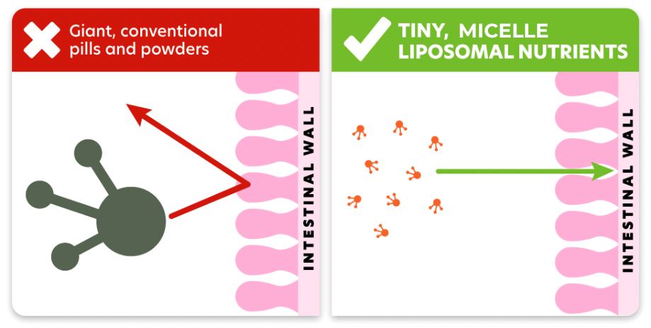 Nutrients get wrapped in protective barriers called “micelles” and “liposomes”, which protects them from stomach acid during digestion and make the nutrients recognizable by the body and welcome for absorption.